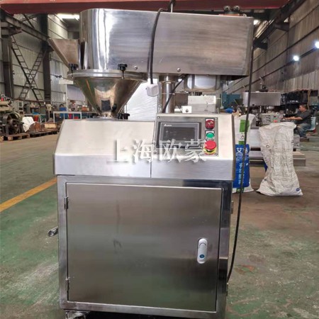 本機(ji)(ji)有送料機(ji)(ji)構(gou)、壓(ya)片(pian)機(ji)(ji)構(gou)、液壓(ya)機(ji)(ji)構(gou)、機(ji)(ji)架和電氣控制(zhi)等部(bu)件組(zu)成(cheng),送料,壓(ya)片(pian)、制(zhi)粒均采用變頻無級調(diao)速,油泵壓(ya)力可(ke)(ke)調(diao),成(cheng)品細度可(ke)(ke)以通過更換(huan)不(bu)同的篩(shai)網獲得。改(gai)進制(zhi)粒轉籠(long),增加了顆粒的成(cheng)品率(lv)。本機(ji)(ji)裝拆、清洗方便,與物料接觸(chu)部(bu)分皆為不(bu)銹鋼制(zhi)作。產(chan)品符(fu)合GMP要(yao)求。物料(liao)由頂部送料(liao)漏斗(dou)加(jia)入,經兩壓輪(lun)強制(zhi)(zhi)擠壓成片(pian)狀后進入下(xia)部制(zhi)(zhi)粒(li)室,在制(zhi)(zhi)粒(li)室中片(pian)狀物料(liao)被(bei)制(zhi)(zhi)粒(li)刀(dao)片(pian)打碎,然后進入整粒(li)室,直(zhi)至顆(ke)(ke)粒(li)小(xiao)于(yu)或等于(yu)網(wang)孔徑,顆(ke)(ke)粒(li)通過網(wang)篩(shai)到盛料(liao)托(tuo)盤。所需要(yao)顆(ke)(ke)粒(li)大小(xiao)可以(yi)通過調(diao)整篩(shai)網(wang)大小(xiao)來決(jue)定(ding)。
