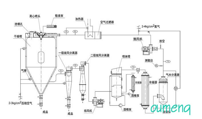 設備主要由:送(song)料系(xi)統(tong)(tong)、加熱系(xi)統(tong)(tong)、霧(wu)(wu)化系(xi)統(tong)(tong)、噴霧(wu)(wu)干(gan)燥系(xi)統(tong)(tong)、惰性氣體循(xun)環系(xi)統(tong)(tong)、產品(pin)回收系(xi)統(tong)(tong)、冷(leng)凝(ning)系(xi)統(tong)(tong)組成(cheng)。